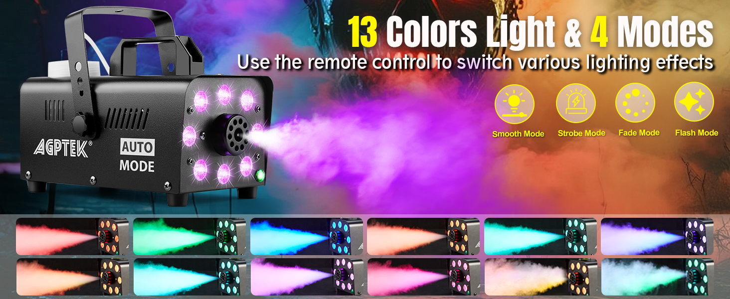 The AGPtEK Upgraded Fog Machine delivers a powerful 2000 CFM fog output paired with 13 customizable RGB LED colors and dynamic light effects. Featuring dual wired and wireless remotes, it offers effortless control over fog and lighting. Built with durable iron and aluminum, it ensures long-lasting use and efficient heat dissipation. Its advanced temperature system enables a quick 3-4 minute warm-up while saving 20% energy, making it perfect for weddings, Halloween, Christmas, and stage events.
